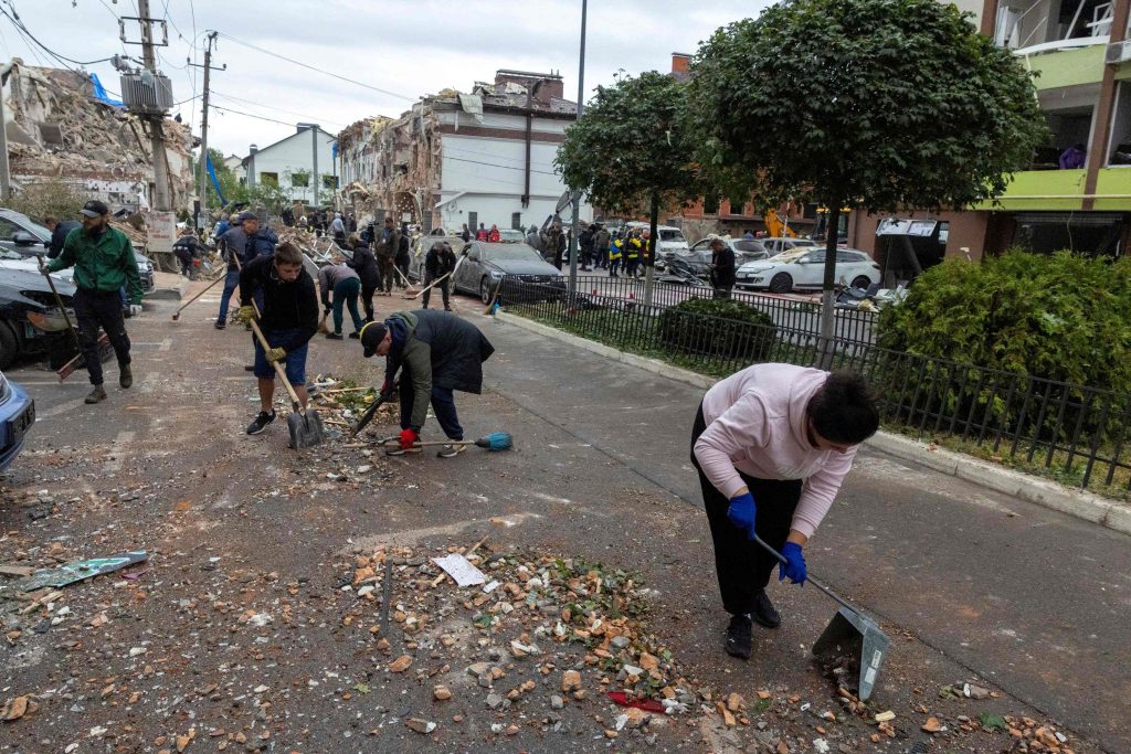 Residents clean up after their neighborhood was hit during Russian drone and missile strikes, amid Russia’s attack on Ukraine, in Kyiv, Ukraine September 28, 2025. REUTERS/Thomas Peter