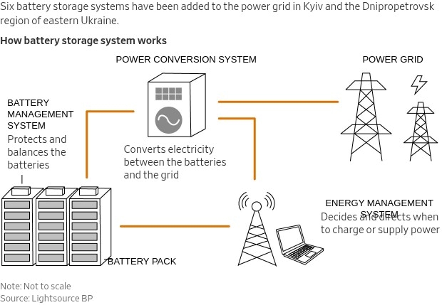 The battery parks, with a combined total capacity of 200 megawatts, can supply around two hours of energy for roughly 600,000 homes, equivalent to powering a city about the size of Washington, D.C. Most crucially, under bombardment the power cells buy engineers time to restore service and prevent a blackout.