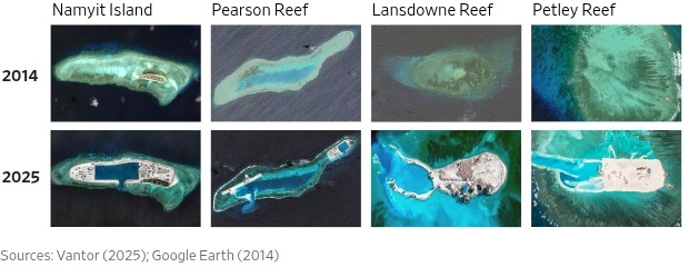 Built from sand, coral and rock carved from the bottom of the sea, the new islands now sport multiple ports, a 2-mile-long airstrip to accommodate large military aircraft, ample munitions storage and defensive trenches that could host heavy weaponry, according to satellite images reviewed by The Wall Street Journal and analysts who study the South China Sea.