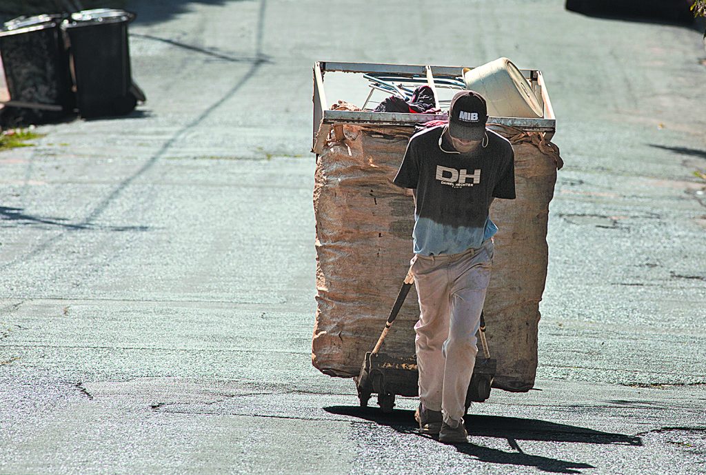 A waste picker carries his load to his collection trolley in a Johannesburg suburb, Feb. 26, 2020. AP photo/ Denis Farrel.