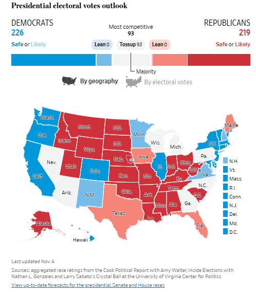 The winner needs 270 electoral votes to win, representing just over half of the 538 total votes.