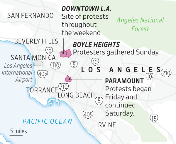 On Saturday, residents of Paramount, a city within Los Angeles County about 16 miles south of the downtown area, saw federal agents gathering in an industrial park. The residents began trying to block the streets nearby. The protest turned into a standoff between federal agents and approximately 300 people, according to the mayor. It lasted most of the day.