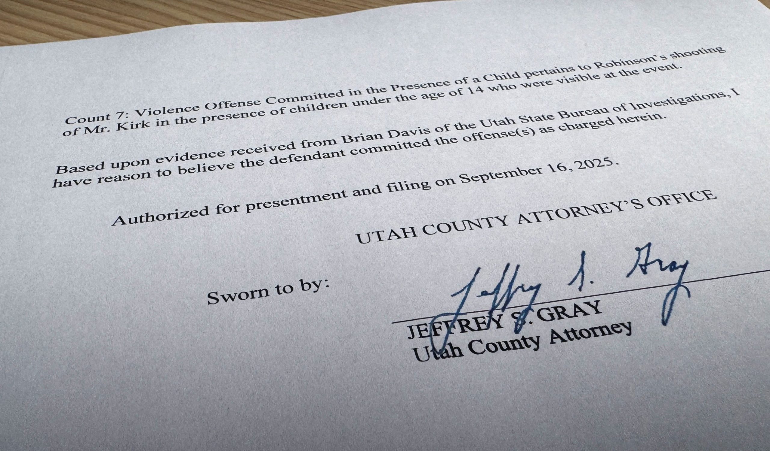 Utah County Attorney Jeffrey Gray on Tuesday underscored that Kirk was killed while appearing before a large crowd on the Utah Valley University campus, a factor he cited as meeting one of the aggravating circumstances in the state’s death-penalty law. Robinson shot and killed Kirk in a manner that “created a great risk of death to others,” Gray said.