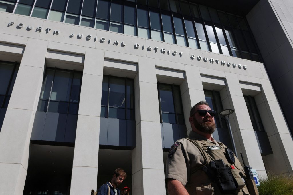 A law enforcement member looks on outside the Fourth Judicial District Courthouse while Tyler Robinson, who is suspected of fatally shooting U.S. right-wing activist and commentator Charlie Kirk, an ally of U.S. President Donald Trump, is expected to be arraigned, in Provo, Utah, U.S., September 16, 2025. REUTERS/Jim Urquhart