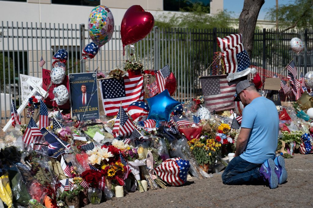 A supporter kneels as tributes grow in memory of right-wing activist Charlie Kirk who was fatally shot during an event at Utah Valley University, outside offices of Turning Point USA in Phoenix, Arizona, U.S. September 16, 2025. REUTERS/Caitlin O’Hara