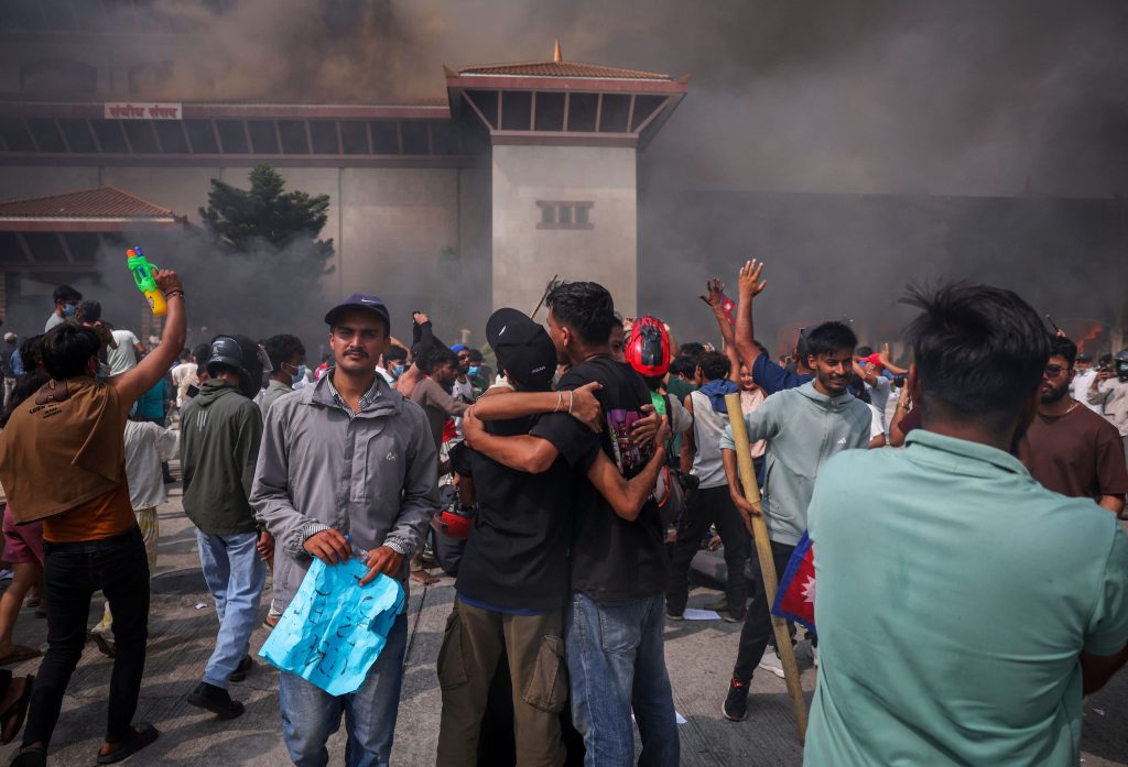 Demonstrators celebrate as smoke rises from the Parliament complex following a fire set during a protest against Monday’s killing of 19 people after anti-corruption protests that were triggered by a social media ban, which was later lifted, during a curfew in Kathmandu, Nepal, September 9, 2025. REUTERS/Adnan Abidi
