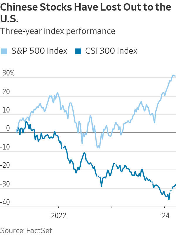 By the end of 2023, the CSI 300 index had fallen for three years in a row. Even worse, stocks in the U.S., Japan and elsewhere had surged. It was supposed to be China’s century , but the economy and the stock market were losing ground to those in other countries.