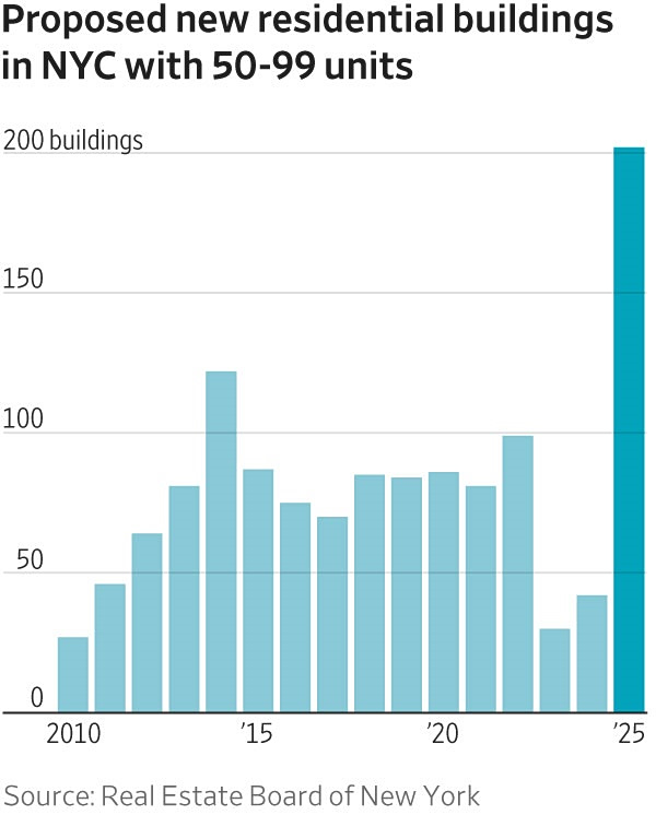 In 2025 alone, developers submitted 202 permit applications for buildings with 50 to 99 units, according to the Real Estate Board of New York, an industry trade group. That is roughly triple the average from 2020 to 2024.