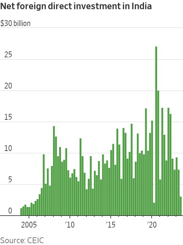 In order for India to punch its geopolitical weight, it needs outside investment to help push the manufacturing sector’s share of GDP up from below 15%, where it has been for years, to somewhere near the official 25% target. But recent signals are mixed. FDI dipped in 2022 and 2023 after hitting record levels in 2020.