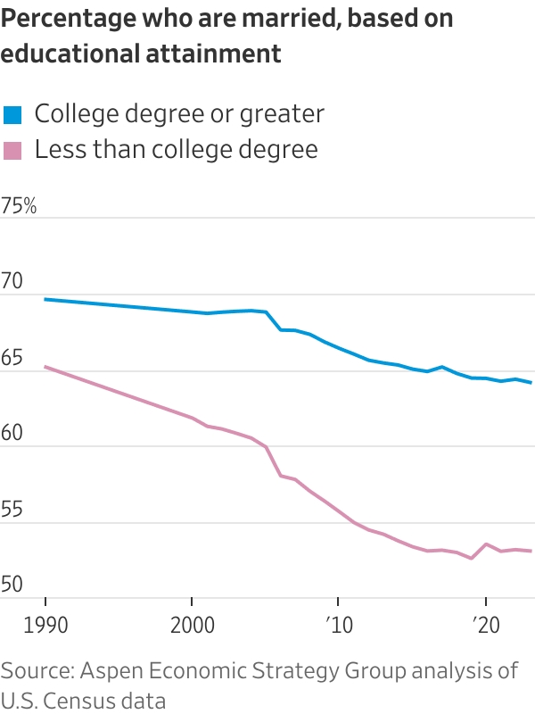 Overall marriage rates have declined much less for 22- to 45-year-olds with a bachelor’s degree than they have for those with less than a college education between 2008 and 2023, according to an analysis of census data by the Institute for Family Studies. The share of married adults in the top third of earners also fell slightly, while dropping much more for the bottom two thirds of the income spectrum.